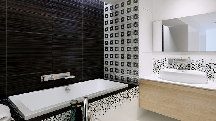 Płytki podstawowe charakteryzują się delikatnym, tonalnym wzorem linii, które optycznie powiększą łazienkę. Inserto natomiast ozdobione jest wyjątkowym geometrycznym wzorem czarnych – mniejszych i większych, jaśniejszych i ciemniejszych – kwadratów. Dekoracja zyskuje nowe oblicze dzięki zróżnicowanym zdobieniom nadającym lustrzane odbicia i świetliste refleksy – płytka została bowiem dodatkowo wzbogacona brokatem, niczym lustrzaną granilią. Trzy kompozycje czarno-białej szklanej mozaiki w formacie 14,8×14,8 cm oraz dekoracja szklana, glass black inserto, w formacie 9,9×29,7 cm stanowią ciekawe uzupełnienie płytek bazowych.