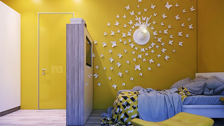 Dość intesywny kolor ściany i sufitu w tym pokoju stonowały białe, papierowe motyle przyklejone do ściany nad łóżkiem.