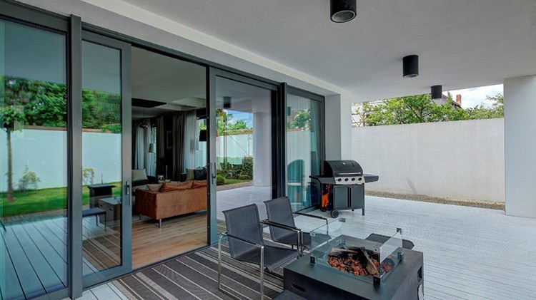Dodatkowo Patio HST, podobnie jak wszystkie okna MS zapewnia dobrą ochronę przed stratami ciepła. Konstrukcja ta, wyposażona w szybę SUPERtermo 0,5 W/m2K z ciepłą kolorową ramką CHROMATECH ultra, ciepły niski próg i termiczne wzmocnienie w ramie, w schemacie A (skrzydło aktywne po lewej lub prawej stronie) o wymiarach 5,6 x 2,4 m osiągają Uw=0,8 W/m2K.