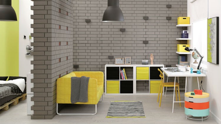 Nowoczesny charakter tego młodzieżowego wnętrza „z pazurem” zbudowano na chłodnej, industrialnej szarości ceglanych ścian. Funkcjonalność pokoju również wyznacza i określa zastosowany materiał wykończeniowy: klinkieru użyto do budowy ścianki dzielącej pokój na część dzienną i wypoczynkową.  Aby nie było nudno, cegły zostały ułożone w taki sposób, by tworzyły swoisty rytm podkreślony „wyciągniętymi” z muru cegłami w kolorze grafitowym i czerwonym.