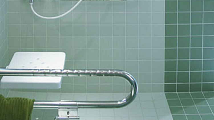 W kabinie powinno być zamontowane uchylne siedzisko prysznicowe, najlepiej z oparciem. Montujemy je na wysokości siedziska wózka, 50 cm od poziomu posadzki i 45 cm od ściany bocznej.