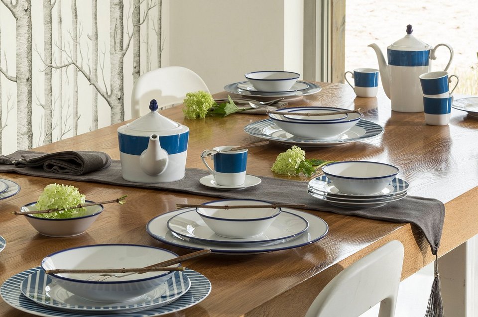 Navy Line to kolekcja stworzona poprzez zestawienie dwóch rodzajów dekoracji: zdecydowanych, graficznych, granatowych pasków i ręcznie malowanej, rozmywającej się kobaltowej linii. Dekoracje te zdobią prostą, smukłą, a zarazem nowoczesną porcelanę.