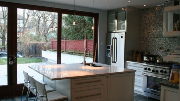 Cechą charakterystyczną tej kuchni są duże okna tarasowe, przez które można wyjść na taras. Kuchnia wyposażona została bardzo praktycznie, choćby przez ustawienie dużej szafy, w której mieszczą się wszystkie naczynia kuchenne.