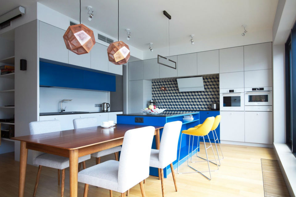 Architekci zaproponowali projekt czerpiący inspiracje ze stylu lat 60-tych. Apartament pełen jest więc graficznych wzorów, kolorów, mebli na toczonych drewnianych nóżkach i wykończonych naturalnymi fornirami. Jednocześnie wnętrze pozostaje całkowicie współczesne: obok ikon designu z połowy ubiegłego wieku, takich jak lampki stołowe Flowerpot Vernera Pantone’a czy słynnego Sunflower Clock Georga Nelsona w mieszkaniu pojawiają się również nowoczesne oprawy, jak projekt Toma Dixona nad stołem w jadalni.