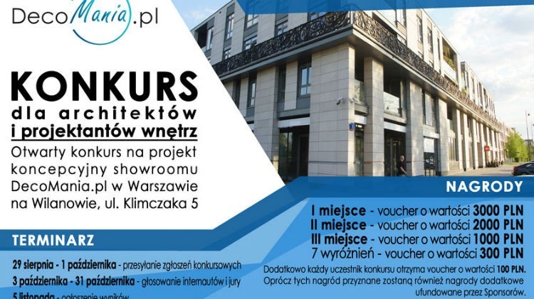 Możesz zostać projektantem nowego showroomu DecoMania.pl, który otworzy swoje podwoje w Warszawie przy ul. Klimczaka 5. Wystarczy, że weźmiesz udział w konkursie na jego projekt koncepcyjny. Zgłodzenia przyjmowane są do 1 października 2016 r. Zapraszamy do wzięcia udziału!