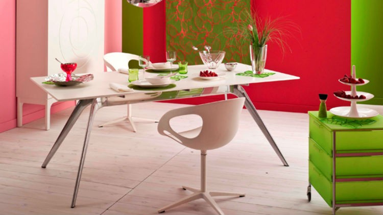 Róż, czerwień i zieleń ścian w jednym wnętrzu – czemu nie? W połączeniu z jasną podłogą i białymi meblami powstaje oryginalna i bardzo wiosenna aranżacja.