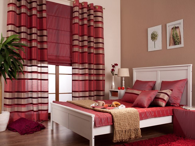 Pustą przestrzeń wokół okna zagospodarowano długimi zasłonami w poprzeczne pasy, idealnie pasującymi do kolorystyki zastosowanej w pomieszczeniu. Pełnią one funkcję ozdoby, natomiast czerwona roleta reguluje ilość światła wpadającego do sypialni. Ważnym elementem całości wystroju pomieszczania są drobne elementy dekoracyjne. Mała galeria zdjęć, świeże kwiaty czy lampka nocna tuż przy łóżku nadadzą wnętrzu przytulny i intymny klimat.