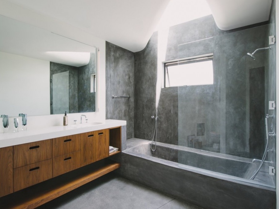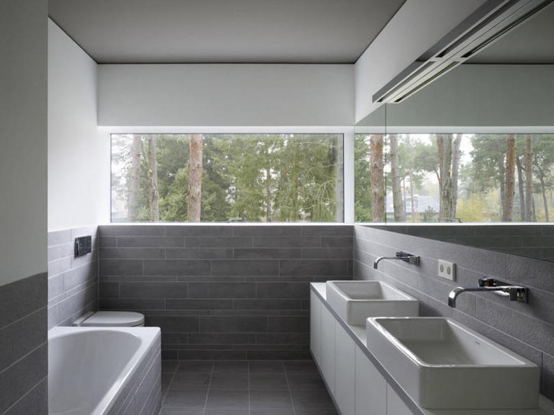 Szare płytki z powodzeniem można zastosować w nowoczesnym i minimalistycznym wnętrzu. Tutaj minimalizm pomaga podkreślić urodę otoczenia. To widok przez okno (dodatkowo zwielokrotniony w lustrze) jest największą ozdobą wnętrzaWe współczesnych łazienkach można z powodzeniem zrezygnować z płytek na ścianach. Zamiast nich, mury można zabezpieczyć specjalnymi preparatami. Szarość ścian i podłogi została pięknie przełamana naturalnym drewnem szafek na kosmetyki, ręczniki i inne drobiazgi