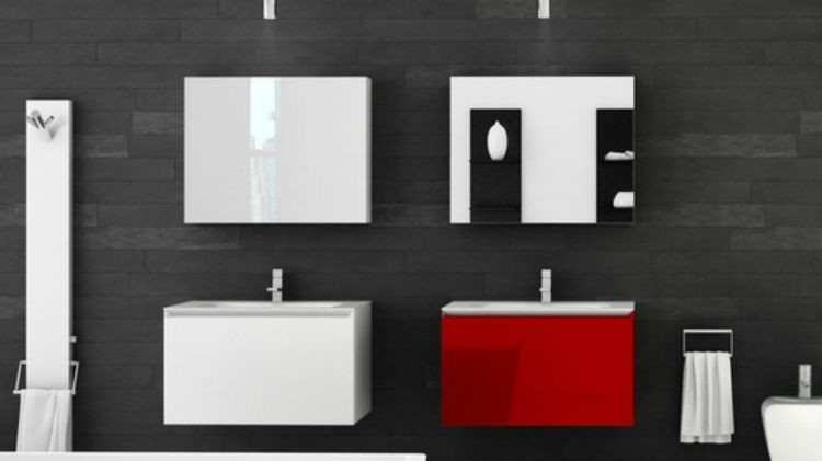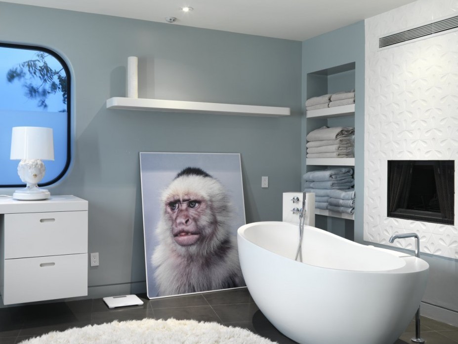 szara łazienka z małpą; źródło: cotemaison.frszara łazienka z czerwoną szafką; źródło: pierdeco.com