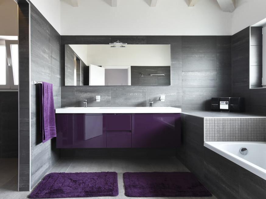 szara łazienka z czerwonymi ręcznikami; źródło: lacuisinedansle bain.comszara lazienka z lila szafkami; źródło: homedesign38.fr