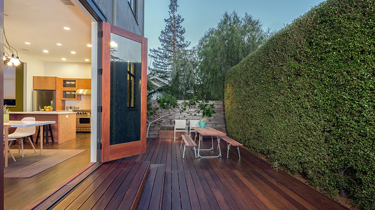 Stosowanie zbliżonych kolorystycznie desek zarówno w salonie, jak i na tarasie to gorący trend, który coraz częściej architekci stosują w projektach domów jednorodzinnych. Firma Kaczkan posiada w swojej ofercie termowane deski drewniane, które pozwalają na wykreowanie efektu przenikania się przestrzeni wewnętrznej z zewnętrzną.