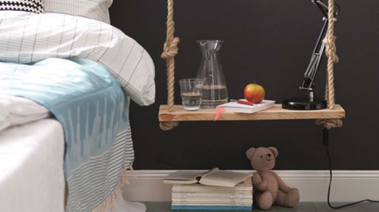 Zawieszona na linach drewniana półka nocna jest nie tylko gustowna i łatwa do zrobienia, ale stanowi też praktyczne miejsce na budzik, lampkę czy książkę.